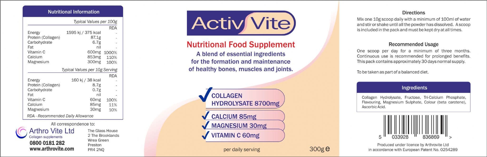 Activ Vite is rich in Collagen Hydrolysate and Calcium, the vital ingredients for the formation of healhty bones and protein for maintaining muscle mass, it also contains magnesium and Vitamin C, essential for the continued maintenance of strong bones and teeth.