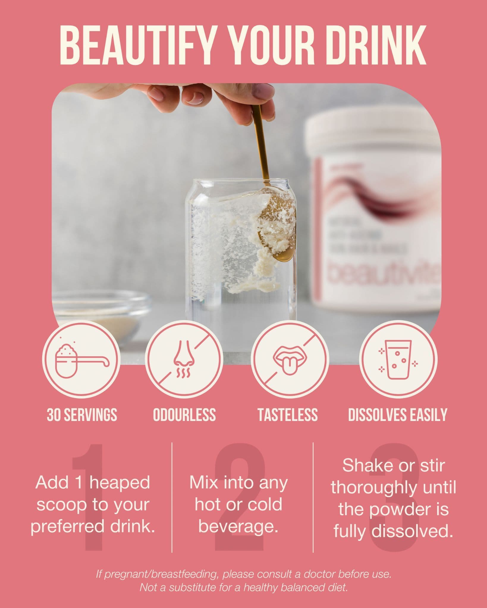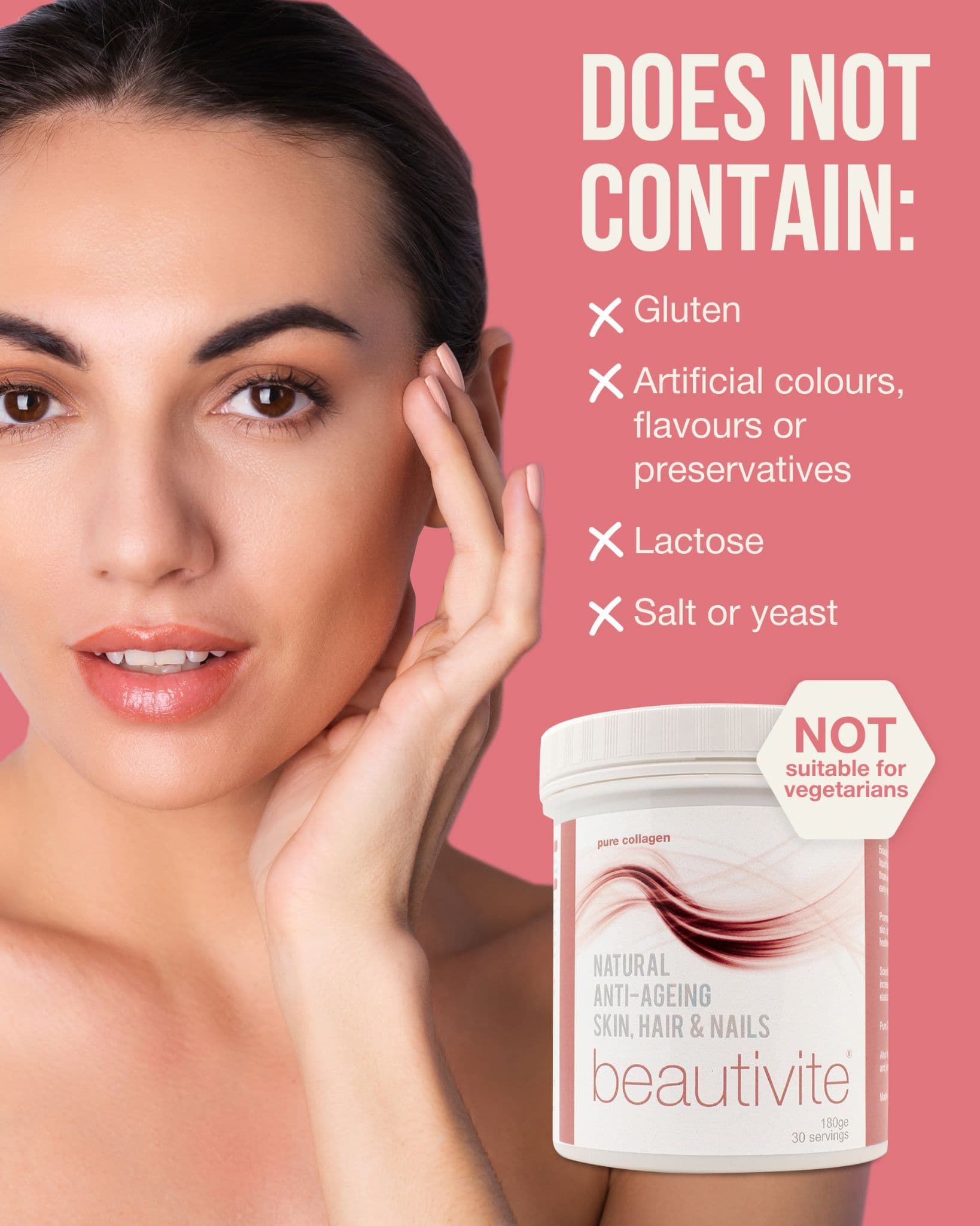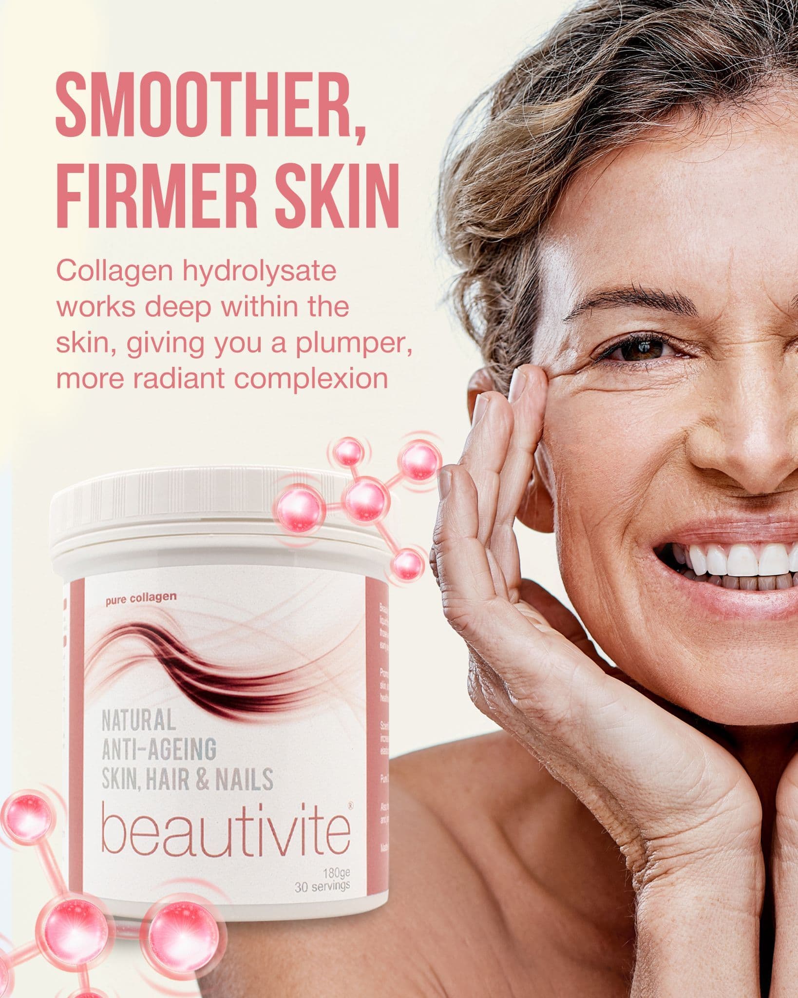 Beautivite Home / Beautivite / Beautivite 180g - 100% Pure Collagen Beautivite 180g - 100% Pure Collagen (2) View more images Beautivite 180g - 100% Pure Collagen (2) £24.50 RRP: £0.00 6000mg of Pure Collagen per serving. A natural route to younger looking skin, stronger nails & healthier hair. Quantity: Please Select Quantity 1 Month Supply £24.50 2 Month Supply £48.00 3 Month Supply £70.00 - SAVE £3.50 6 Month Supply £135.00 - SAVE £12.00 Information Specifications Reviews Beautivite provides 6000mg of Pure Collagen per serving. A natural route to younger looking skin, stronger nails & healthier hair. Designed for women who seek a youthful appearance and a general sense of well-being. Scientifically formulated to increase hydration and elasticity and help offset the signs of ageing (from the age of 25, skin becomes dull and lifeless and elasticity reduces to cause unwanted lines and wrinkles). Offers 6000mg of pure collagen protein to provide the amino acids which support the building blocks of skin, hair and nails. Also helps to maintain muscle & joint comfort. Improves skin hydration & radiance, reduces fine lines & wrinkles Promotes healthier hair & stronger nails Totally natural, no additives/fillers Flavourless, odourless and easily absorbed, simply add to any hot or cold drink Visible signs within 8-10 weeks Made in the UK Free From: Gluten ~ Artificial Colours, flavours & preservatives ~ Lactose ~ Salt or Yeast Replacing lost collagen From around the age of 25 collagen levels reduce by about 1.5% every year. This contributes to skin losing it's elasticity, hair & nails becoming brittle and a general stiffening of joints. By the age of 45 collagen levels have reduced by up to 30%. Complement your diet and daily beauty regime with Beautivite pure collagen. Collagen is an essential protein that provides amino acids to support the building blocks of your skin, hair and nails, whilst stimulating your body’s natural production of collagen. Collagen is the major structural component of skin, comprising circa 80% of its dry weight. Skin properties are known to be detrimentally affected by sun damage, hormones and nutrition. During the natural ageing process, skin loses its firmness, resulting in wrinkles and loss of elasticity. Nothing but collagen beautivite - pure collagen hydrolysate beauty supplement; provides 100% of what you do need and 0% of what you don't - No artificial colours, flavours, fillers or preservatives. Free from: gluten, lactose, salt or yeast. Odour & tasteless - simply add to any hot or cold drink. Caroline H. - Great product, I've used beautivite for over 3 months & I can definitely feel and see the benefits. I've taken collagen supplements for years and this offers the best value considering the high levels of collagen per serving, I also love the fact it's flavourless so I can add it to anything. Directions: Add 1 heaped scoop to drink of choice and shake/stir until powder is fully dissolved. Each 180g pack contains 30 daily servings. General Information: Keep out of sight/reach of children and store in a cool, dry place. If pregnant/breastfeeding, please consult a doctor before use. Not a substitute for a healthy balanced diet. Continuous use (min. three months) recommended for prolonged benefits. Produced under licence by Arthro Vite Ltd in accordance with European Patent No. 0254289. Ingredients / Nutrition: 6000mg of Pure Collagen Hydrolysate protein per serving. Condition: New Product Code: BV180 Weight: 0.18kg Customer reviews (2 Customer reviews) Write A Review 5 Stars 100% 4 Stars 0% 3 Stars 0% 2 Stars 0% 1 Stars 0% Most RecentTop Rated Brilliant. My skin has significantly improved now after using one scoop every morning in my smoothie for ALMOST A YEAR NOW. I wanted to wait until I felt I could give an honest review. People think I'm 10 yrs younger, now more than ever. It won't make you younger of course, but my skin DOES feel significantly softer and more "even", less breakouts or allergic reactions/redness in the T-zone. Danielle | | September 2018 Great product, I've used it for over 3 months & I can definitely feel and see the benefits. I've taken collagen supplements for years and this offers the best value considering the high levels of collagen per serving, I also love the fact it's flavourless so I can add it to anything. Caroline H. | Lytham | January 2017