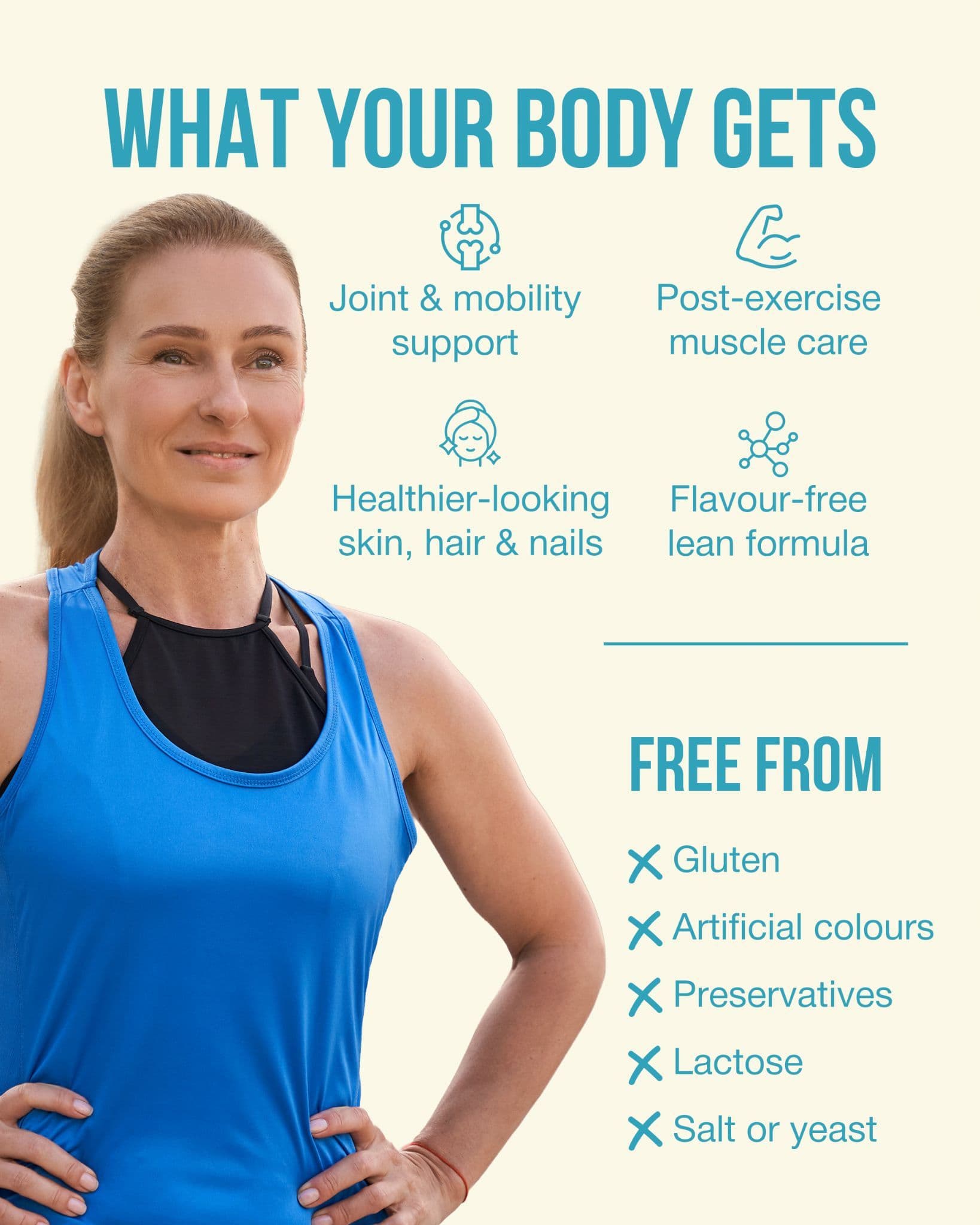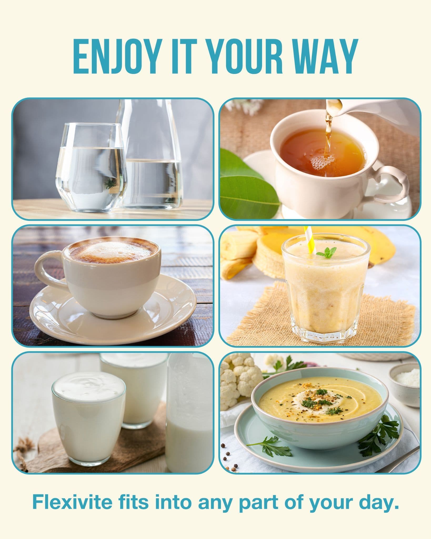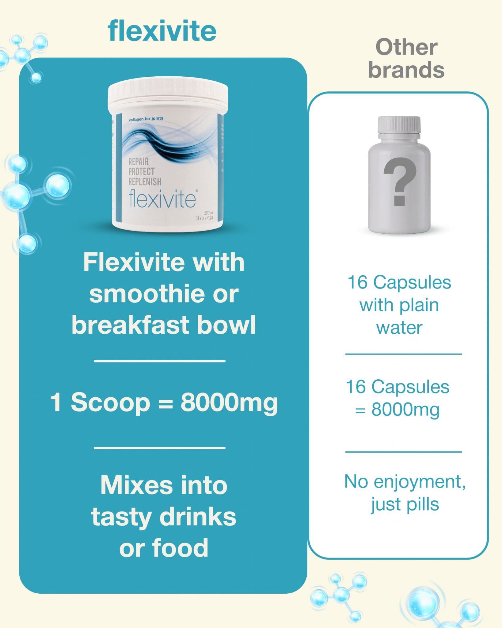 Flexivite supplies 8000mg of pure collagen protein per serving. Quick and easy for active people on the go; simply add to water, hot or cold drinks - even yoghurt and soup etc. Odour and taste free, with no additives or flavourings.